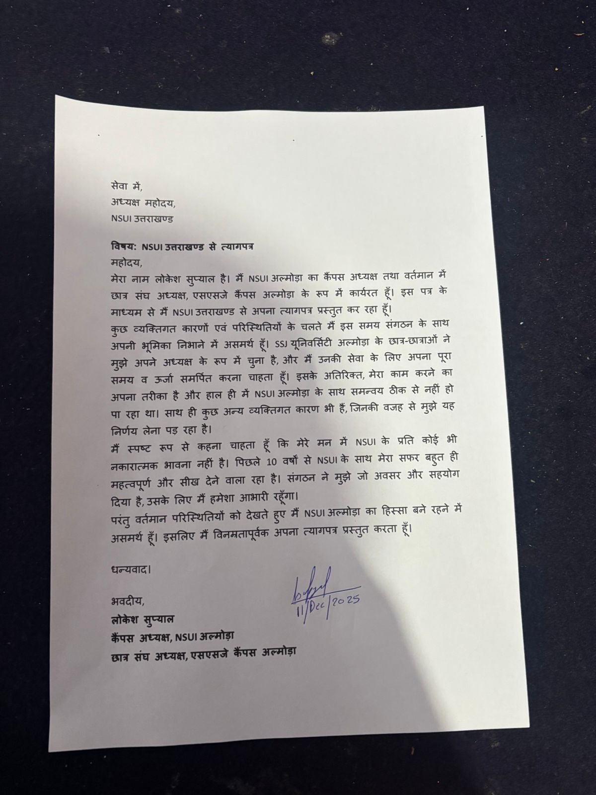 अल्मोड़ाः   SSJ यूनिवर्सिटी कैंपस अल्मोड़ा के छात्र संघ अध्यक्ष लोकेश सुयाल ने NSUI संगठन से अपने सभी पदों से इस्तीफ़ा देकर छात्र राजनीति में नई हलचल पैदा कर दी है। एक औपचारिक पत्र जारी करते हुए लोकेश सुयाल ने अपना त्यागपत्र NSUI उत्तराखंड नेतृत्व को सौंप दिया।