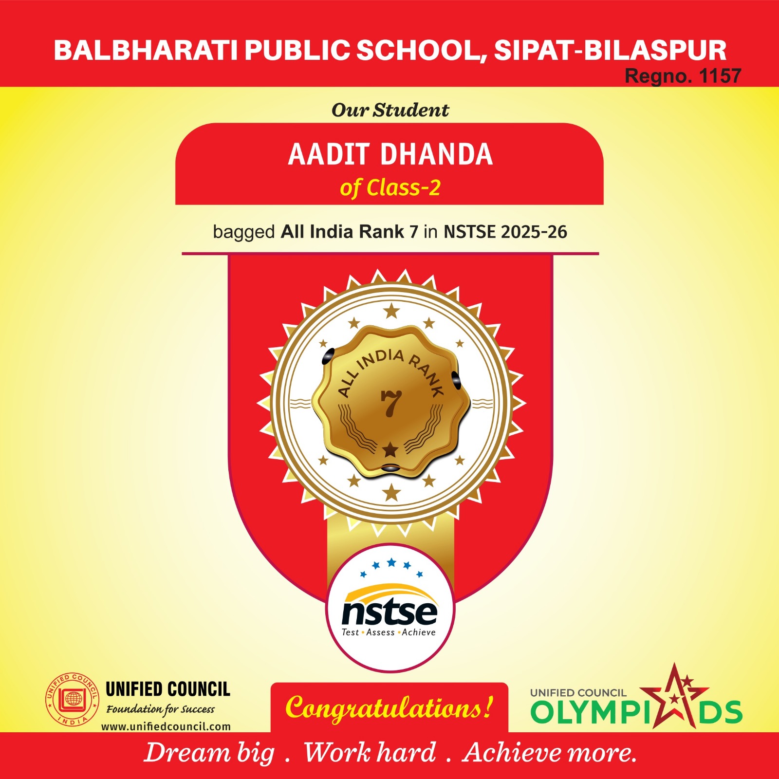 बिलासपुर, छत्तीसगढ़ः एनटीपीसी., सीपत स्थित बाल भारती पब्लिक स्कूल के कक्षा दूसरी के मेधावी छात्र आदित ढांडा प्रतिष्ठित NSTSE (2025-26) परीक्षा में अखिल भारतीय स्तर पर 7 वीं रैंक प्राप्त कर विद्यालय और अपने माता-पिता का नाम रोशन किया है। इस ऐतिहासिक सफलता पर विद्यालय के प्राचार्य श्री शलभ निगम ने प्रसन्नता व्यक्त करते हुए आदित की मेहनत, लगन और एकाग्रता की सराहना की। उन्होंने इस उपलब्धि को शिक्षकों के मार्गदर्शन और स्कूल की उत्कृष्ट शिक्षा प्रणाली का परिणाम बताया।